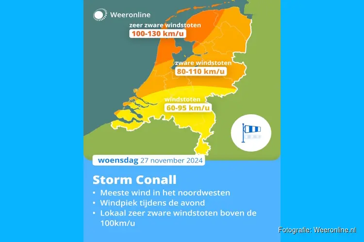 Vanavond komt aan de Noordzeekust van Noord-Holland en later ook in het noordelijke kustgebied een noordwester- tot noorderstorm te staan, windkracht 9. Er is een kleine kans op tijdelijk zware storm, windkracht 10. Daarbij zijn er vooral in Noord-Holland, het westen van Friesland en het noordelijke kustgebied zeer zware windstoten mogelijk van 100 tot 120 km/uur, lokaal 130 km/uur. In de rest van Friesland en Groningen en in Drenthe, Flevoland en het noorden van Overijssel zijn windstoten mogelijk van 90 tot 110 km/uur.