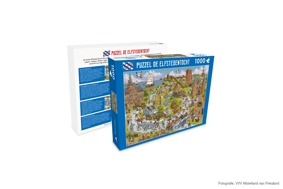 De 1.000-stukjes tellende puzzel, ontwikkeld door VVV Waterland van Friesland in samenwerking met Kids Marketeers, is inmiddels al door vele puzzelliefhebbers besteld. Het kleurrijke ontwerp bevat een bonte verzameling Elfstedeniconen: van een ijstransplantatie en een zwemmende Maarten van der Weijden, tot enthousiaste suppers, het Vrouwtje van Stavoren, het stadhuis van Bolsward, een camper op Elfstedenroute, fietsers (ook op tandem) en een dweilorkest ontbreekt natuurlijk ook niet. “Je kunt tegenwoordig de Elfstedentocht wandelen, varen, fietsen, suppen en natuurlijk – als het weer het toelaat – schaatsen. Maar nu kun je ’m ook rustig aan de keukentafel beleven”, zegt Simonia de Boer, hoofd retail en gastvrijheid bij VVV Waterland van Friesland. “De puzzel is een feest van herkenning voor elke liefhebber van Friesland.”